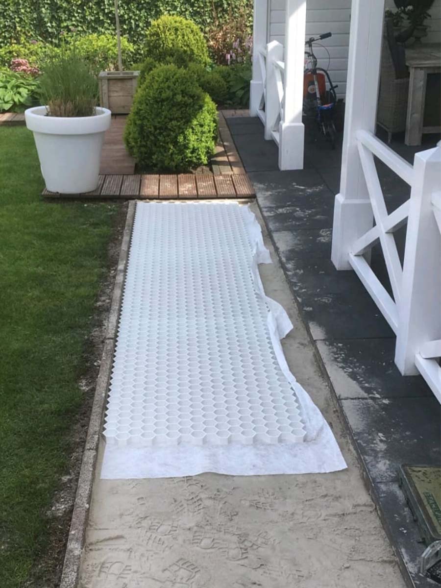 - Zeer eenvoudig en snel te leggen (direct tegen elkaar te plaatsen), worteldoek zit reeds aan de plaat bevestigd