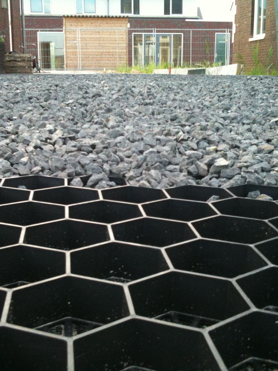 Grote, zeer drukvaste zwarte splitplaten / grindroosters van het merk Easygravel, met handig kliksysteem, zonder anti-worteldoek. Voorkomt de vorming van kuilen en spoorvorming in grind of siersplit.