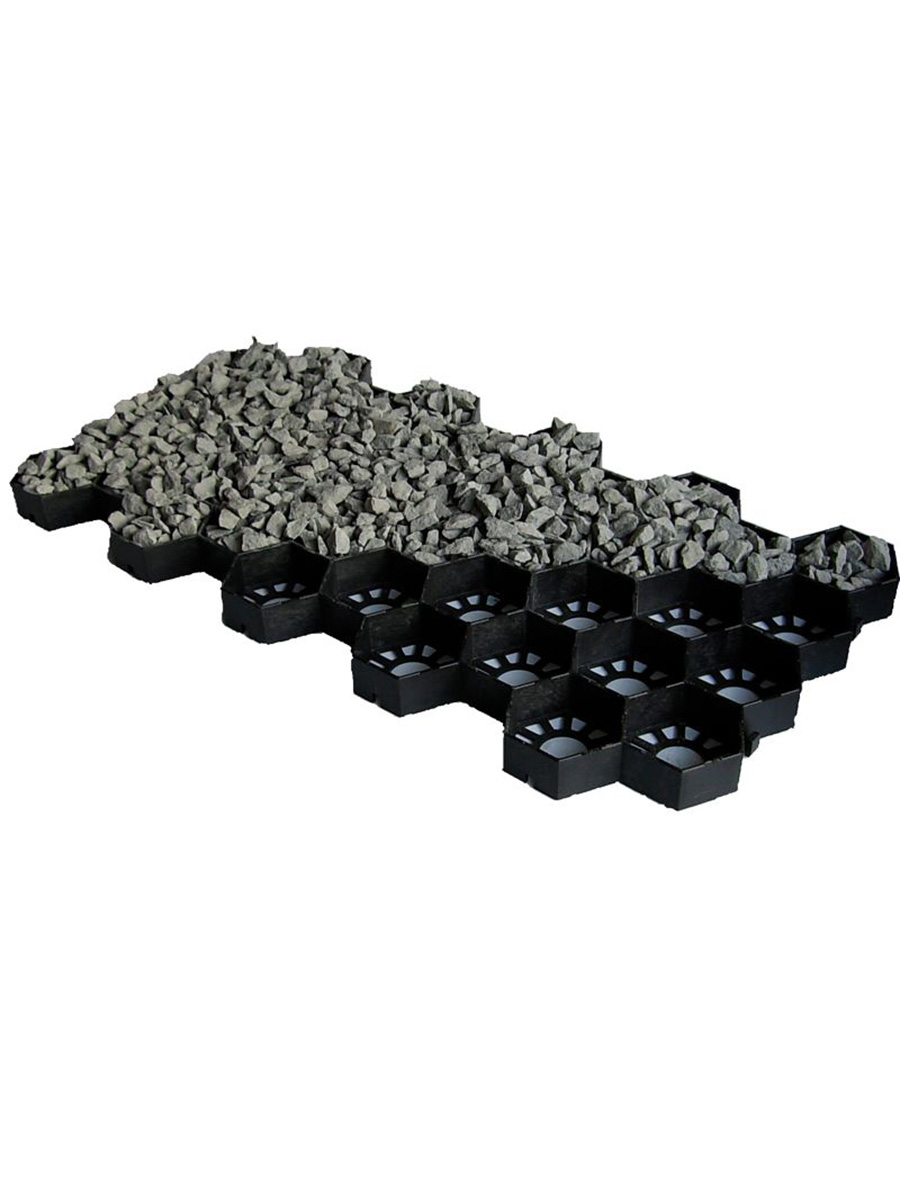 Kleine, zeer drukvaste zwarte splitplaten / grindroosters van het merk Easygravel, met handig kliksysteem, zonder anti-worteldoek. Voorkomt de vorming van kuilen en spoorvorming in grind of siersplit.