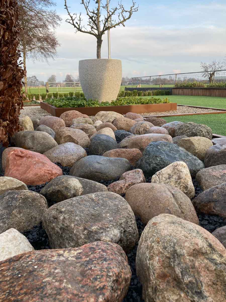 Deze verbazingwekkend mooie Gletsjerkeien, ook wel Scandi keien genoemd, zijn mooie afgeronde stenen met grijs, beige en roze tinten, perfect te gebruiken ter decoratie van uw tuin. Deze keien worden vaak gebruikt bij het ontwerpen van tuinen en bij landschapsarchitectuur, zoals vijvers en waterpartijen, maar ook voor beplantingsgebieden en rotstuinen.