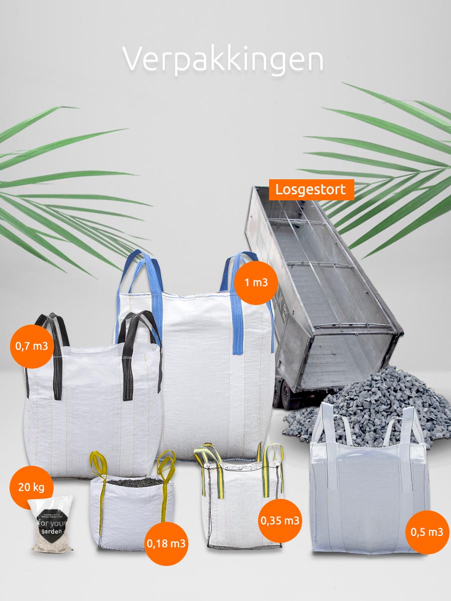 | Levermethode | • Bags 200-900kg: Bodedienst met palletwagen • Bags vanaf 1000kg en grindmatten: Stenentrailer met kraantje. Deze kan de materialen 3-4m buiten de wagen neerzetten • Losgestort: Kiptrailer of Walking floor |