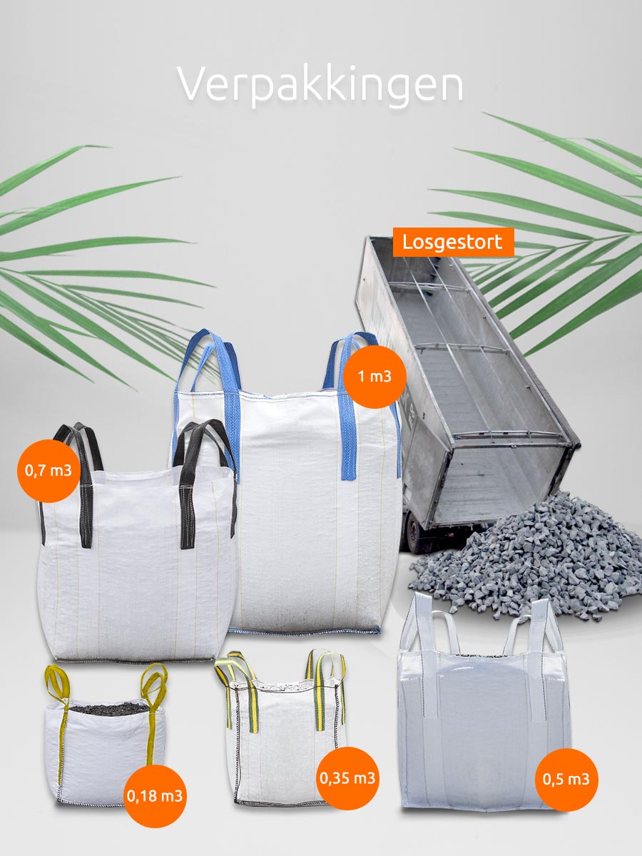 | Levermethode | • Bags 200-900kg: Bodedienst met palletwagen • Bags vanaf 1000kg en grindmatten: Stenentrailer met kraantje. Deze kan de materialen 3-4m buiten de wagen neerzetten • Losgestort: Kiptrailer of Walking floor |